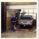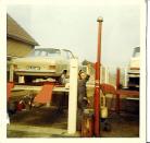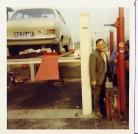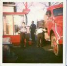 Onze voormalige chef werkplaats Arie Stokkel, toen nog erg jong, voor de garage. Rechts de toenmalige smeerbrug. |